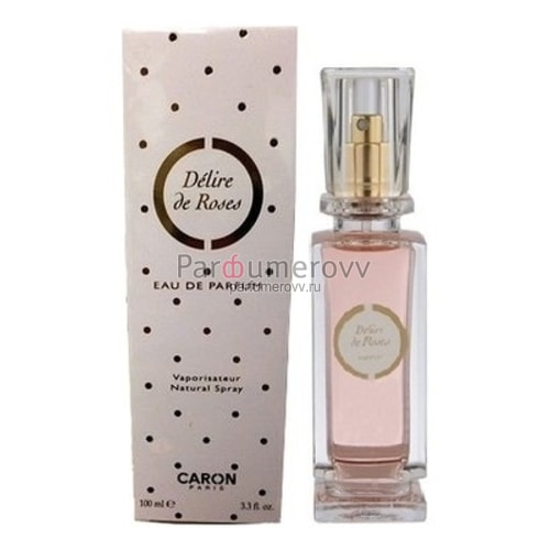 Caron Delire de Roses («Карон. Делир де Роз»). Этот роскошный аромат для женщин запущен знаменитым парфюмерным домом Caron в мае 2011 года.Роскошный флакон аромата сочетает в себе изысканность прозрачного флакона и нежную округлость линий.Парфюмерная композиция непревзойденного аромата для женщин Caron Delire de Roses открывается начальными нотами абсолю жасмина и личи, которые переплетаются с сердечными нотами листьев розы и ландыша, оставляя нежный ароматный шлейф из нот абсолю цветков лотоса и лепестков различных сортов роз.
