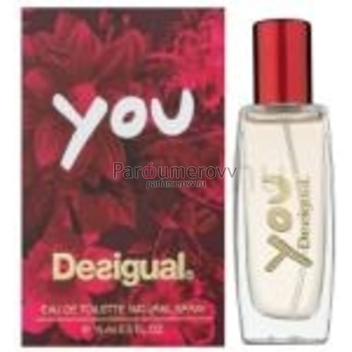 You Desigual - это аромат для женщин, принадлежит к группе ароматов восточные цветочные. Это новый аромат, You выпущен в 2015. Парфюмер: Olivier Cresp. Верхние ноты: Ревень, Грейпфрут, Фиалка, Бергамот и Мандарин; ноты сердца: Бензоин, Белый кедр, Апельсиновый цвет, Мускус и Бобы тонка; ноты базы: Пралине, Жасмин, Кофе и Кардамон.
