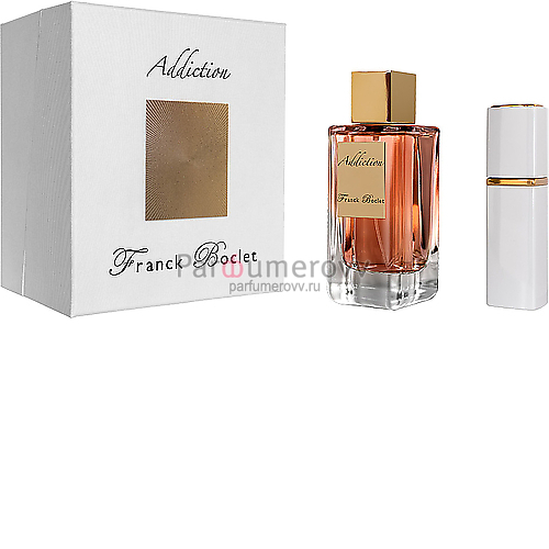Franck Boclet Addiction — искушающий и гламурный женский цветочно-пряный аромат с нотками душистой сочной зелени, выпущенный в 2021 году французским домом моды Franck Boclet. Неординарный парфюм идеально отражает концепцию бренда и станет прекрасным дополнением к образу современной дерзкой и самодостаточной женщины. В верхнем аккорде парфюм Addiction дарит цитрусовую свежесть бергамота, ледяное дыхание душистой мяты, запах сочных листьев гльбанума и травянистую пряность базилика. После очень свежего и ароматного начала сердце композиции пылает пьянящей туберозой, окутанной нотами жасмина, иланг-иланга и флердоранжа. Наконец в финальном аккорде Franck Boclet Addiction древесные ноты сандала и кедра, пряные оттенки перуанского бальзама, волнующий мускус и утонченная ваниль придают аромату особу глубину и чувственность звучания.