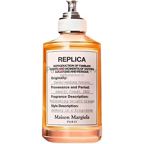 Maison Martin Margiela Never-Ending Summer — яркий летний пряно-цитрусовый унисекс- аромат, выпущенный в 2025 году брендом Maison Martin Margiela в рамках коллекции Replica. Аромат призван вызвать яркую сущность беззаботного итальянского лета с его сочной апельсиновой нотой и утонченной структурой. Парфюм сформирован вокруг уникального итальянского аккорда спритца — фирменного итальянского коктейля, мгновенно узнаваемого по его вдохновляющим цитрусовым нотам. Трансформируя бодрящую пикантность классического итальянского аперитива в обонятельную форму, поднимающая настроение, оживляющая ольфакторная нота спритца мгновенно переносит на побережье Италии. В начале звучания парфюма аккорд спритца переплетается с горьким апельсином, с его пикантным, оживляющим ароматом, напоминающим свежеочищенный апельсин, и пряными нотками черного и розового перцев. В сердце композиции шелковисто-пряный запах чая Эрл Грей соединяется с горьковато-цитрусовыми аспектами кардамона и тонкими специевыми оттенками мускатного ореха. В финальном аккорде доминирует ольфакторная яркостью ветивера, чья чувственность передает изысканную глубину, задерживаясь на коже, как тепло летнего дня. Его длительная нота ощущается как теплые объятия, пробуждая предвкушение летних приключений. Древесные ноты кедра и кашмерана, пряно-землисты ноты пачули, перуанский бальзам и сладость ванили мягко и органично вплетаются в композицию Maison Martin Margiela Never-Ending Summer, придавая ей объем и фактурность.
